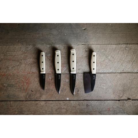 Ergonominen kahva valmistettu huolellisesti valitusta saarnista, joka on kotoisin Eurooppalaisista FSC-sertifioiduista metsistä. Kahva varustettu sormisuojalla, ja suunniteltu tarjoamaan ihanteellisen tasapainon suurella työstötarkkuudella lukuisilla erilaisilla otteilla käytettynä. Terässä tehokas drop-point kärki. Hamarapuoli suunniteltu yhteensopivaksi tuluksien kanssa käytettäväksi.