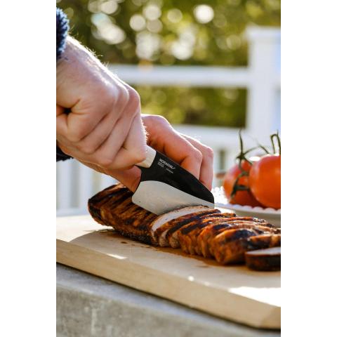 Ergonominen kahva valmistettu huolellisesti valitusta saarnista, joka on kotoisin Eurooppalaisista FSC-sertifioiduista metsistä. Kahva varustettu sormisuojalla. Veitsen optimaaliseen tasapainoon on kiinnitetty tuotekehityksessä erityistä huomiota. Ergonomia on kehitetty sitä silmällä pitäen että veitsestä pidetään kiinni lukuisilla erilaisilla otteilla kunkin tehtävän mukaisesti, haluttiin sitten esim. jakaa, pilkkoa, viipaloida tai kuoria.