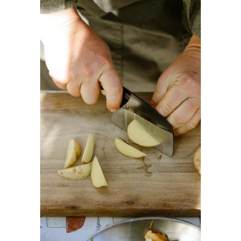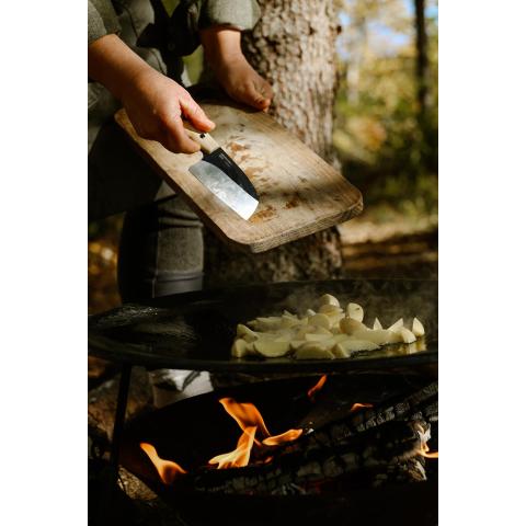 Käsityönä valmistettu ohutteräinen full tang veitsi, joka on suunniteltu ihanteelliseen ruuanlaittoon ulkoilmaolosuhteissa. Kompakti ja monipuolinen malli, joka on suunniteltu kulkemaan helposti mukana taskussa tai repussa. Varuste, joka mahdollistaa kokkaustaitojen kehittämisen uudelle tasolle. Toimitetaan kasvivärjätyn nahkasuojuksen kanssa, joka suojaa veitsen terää huolellisesti.