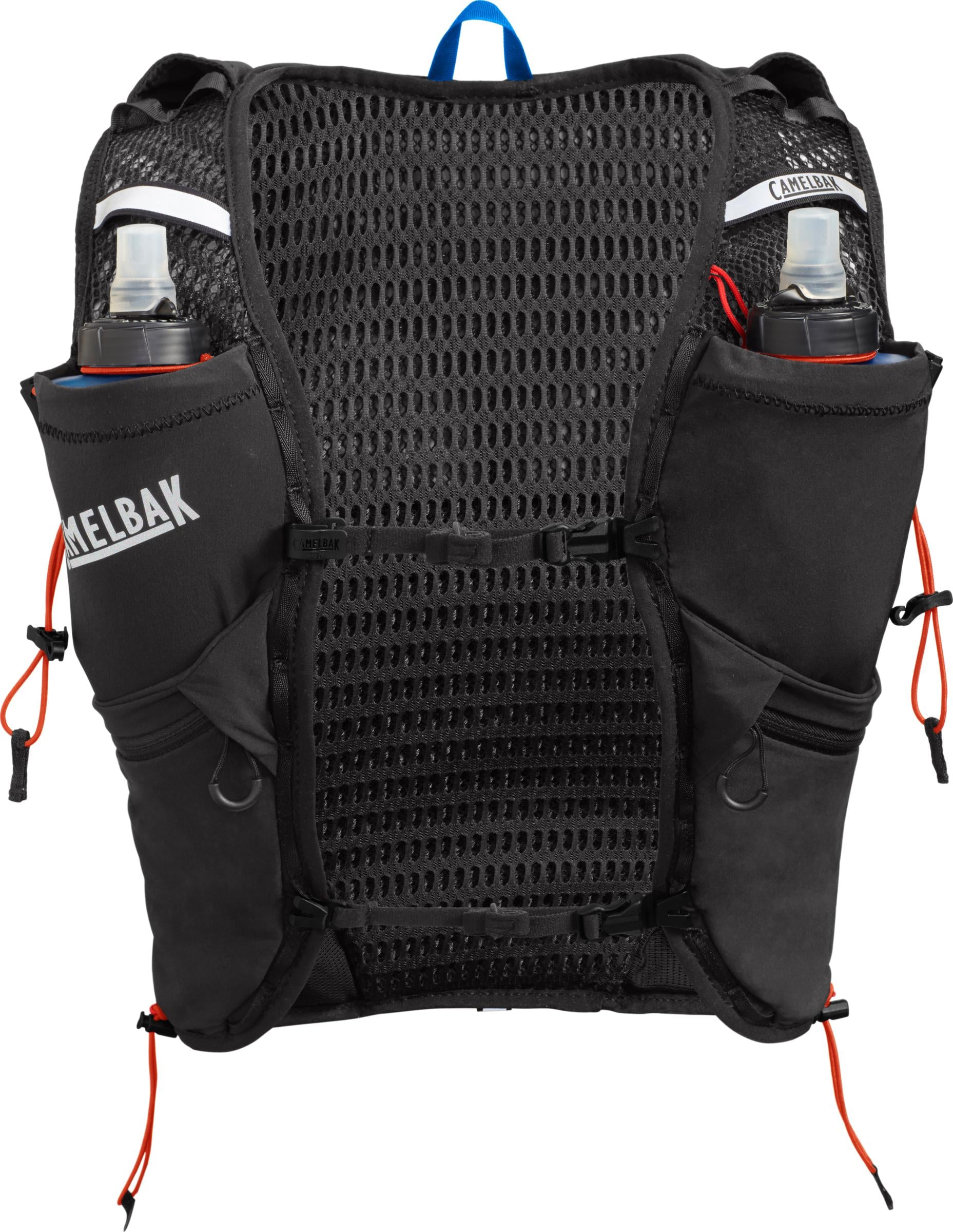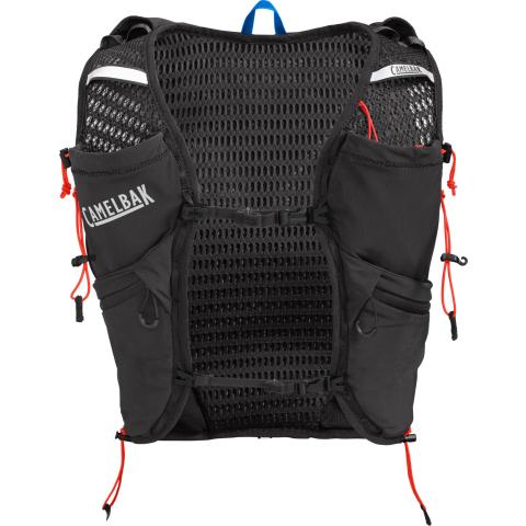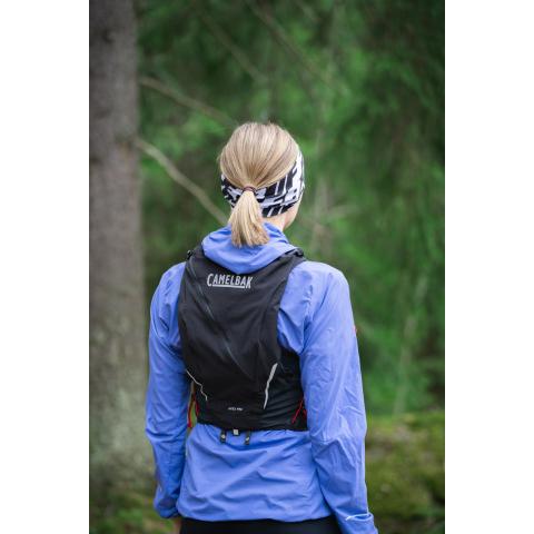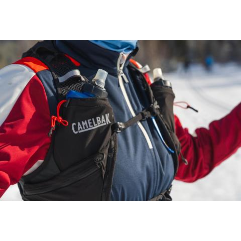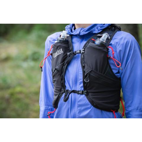 Liivi on suunniteltu ultrakevyeksi ja mallin istuvuus on huippuluokkaa, jolloin se pysyy paikallaan vauhdikkaammassakin kisassa. Etupuolella on kaksi joustavaa taskua CamelBak Quick Stow 0,5L pulloille (sis.), jolloin juoksijalla on mahdollisuus varata toinen pullo vaikka urheilujuomalle ja toinen vedelle.
