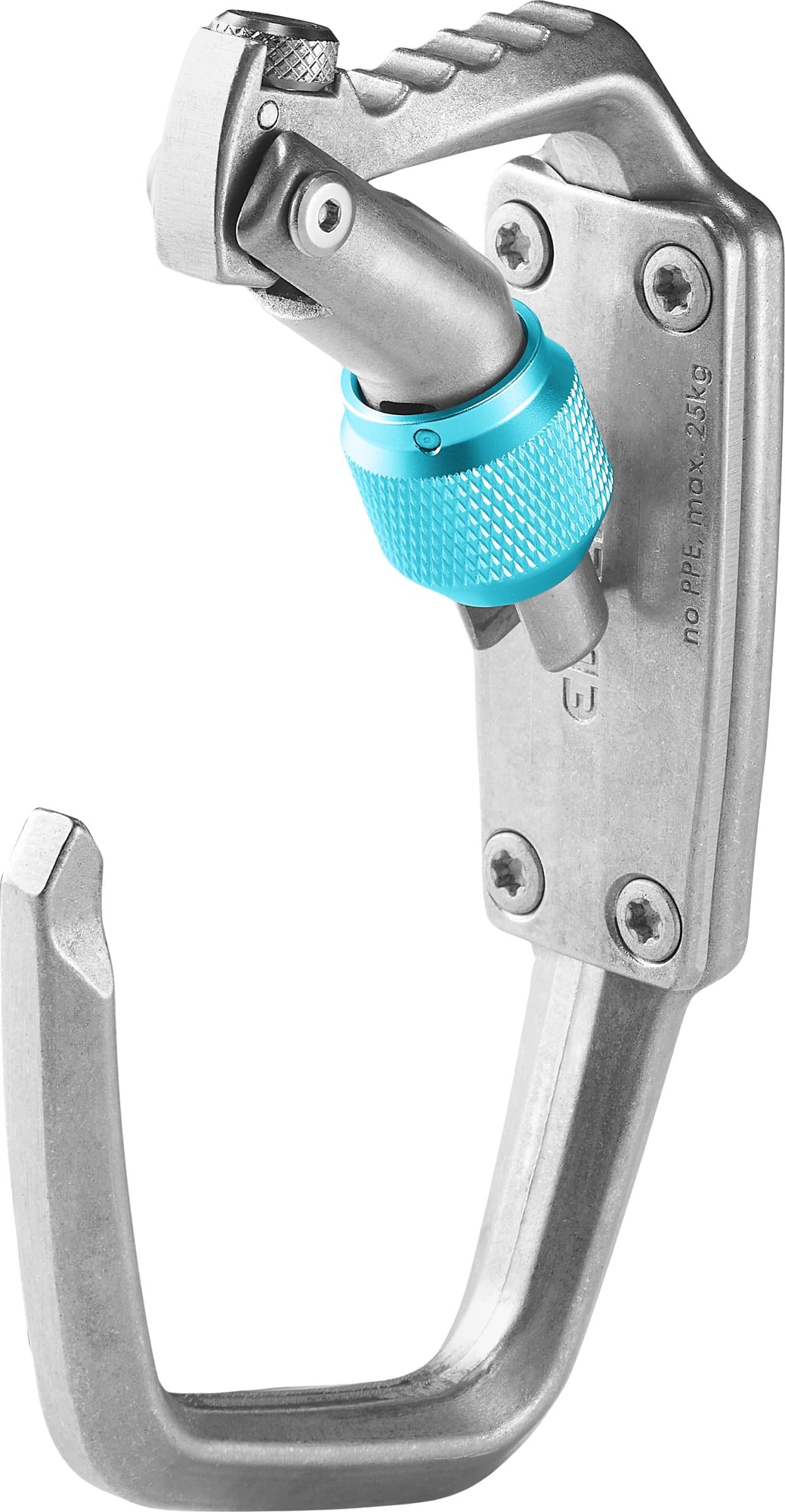 Portti pysyy haluttaessa kokonaan auki ja mahdollistaa kiinnittimen käytön avoimena varustekoukkuna (patent pending)
