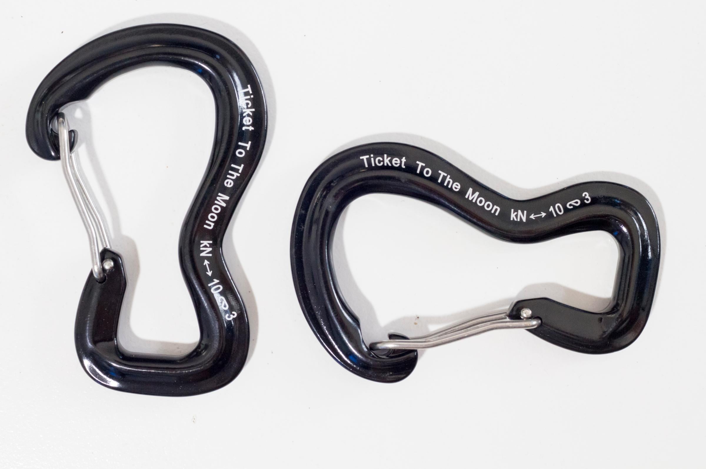 Korkealuokkainen karabiinipari hammockin tai riipputuolin ripustamiseen. Helpoin ja turvallisin kiinnitystapa. Kaikki alueet hiottu sileiksi, jotta karabiinissa ei ole kohtia, jotka voisivat kuluttaa tarpeettomasti köyttä tai hammockia.