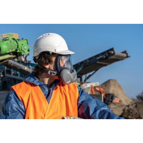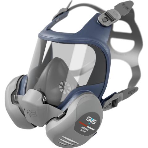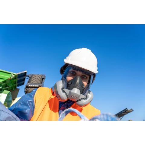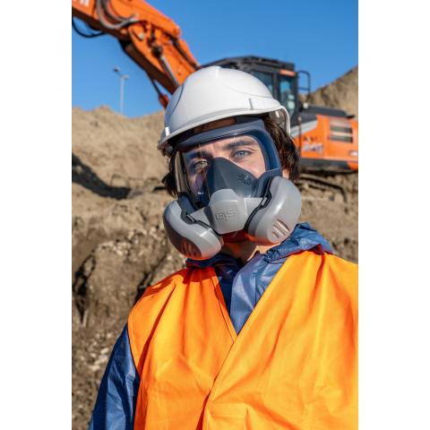 Kevyt kokokasvomallinen hengityksensuojain tiiviillä silmiensuojaimella ja vaihdettavalla A2P3 R D yhdistelmäsuodatinparilla: Hiukkassuodatus ja kaasusuodatus. Poikkeuksellisen leveä näkökenttä.