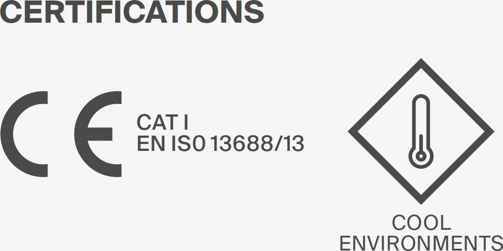 - Sertifiointi: EN IS0 13688/13. Riskiluokka I henkilönsuojain. CE.