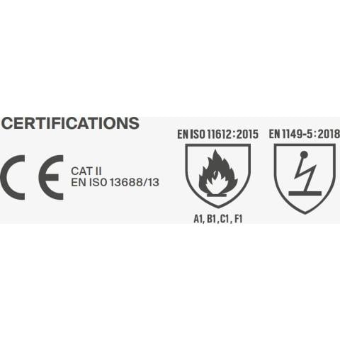 - Täyttää EN ISO 13688/13, EN ISO 11612/15 luokka A1, B1, C1, F1 ja EN 1149-5/18 standardien vaatimukset. CE.
