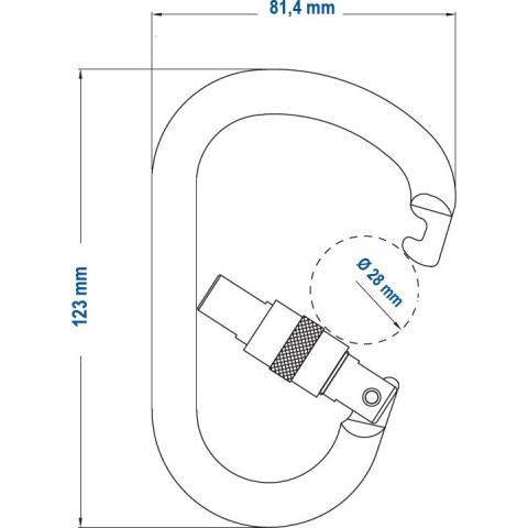 EN362. CE. Materiaali: teräs. Portin avauma 28 mm. Max kuorma 35 kN. Paino 274 g. Ulkomitat: Leveys 81 mm. Pituus 123 mm. Maksimielinikä 10 vuotta.