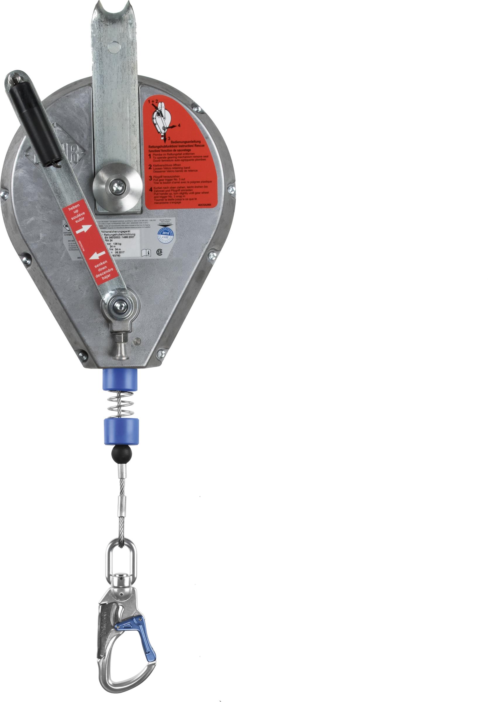 Tajuntansa menettänyt työpari voidaan nostaa nopeasti ja turvallisesti esim. suljetussa tilassa olevan kaasun yläpuolelle tai pois ahtaasta tilasta. Kelan sisällä integroitu nykäyksenvaimennin, joka rajoittaa käyttäjään kohdistuvia nykäysvoimia putoamisen pysäyttämisessä. Kuori alumiinia, liitoselin vaijeri. Käyttäjän alta vaadittava esteistä vapaa turvaetäisyys, kun laite on kiinnitetty suoraan käyttäjän yläpuolelle: 2,4 m. Paino 16 kg. Ulkomitat: 63 cm x 27 cm x 22 cm. CE DIN EN360/1496. Tarkastustoiminta nopeasti Suomessa. Käyttöikä 10 vuotta.
