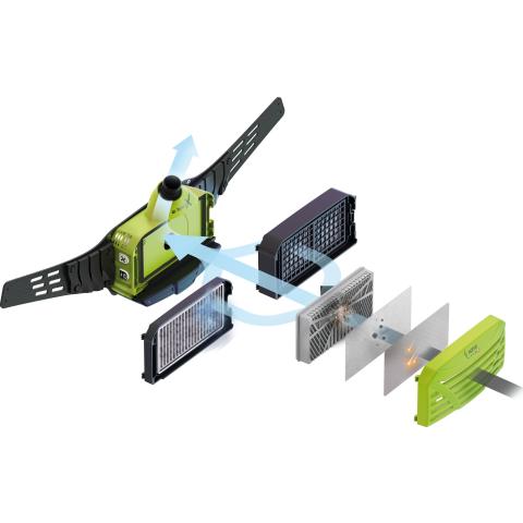 Optrel re-charge: Maski toimii aurinkopaneelilla. ja li-ion akun voi ladata Micro-USB johdolla.