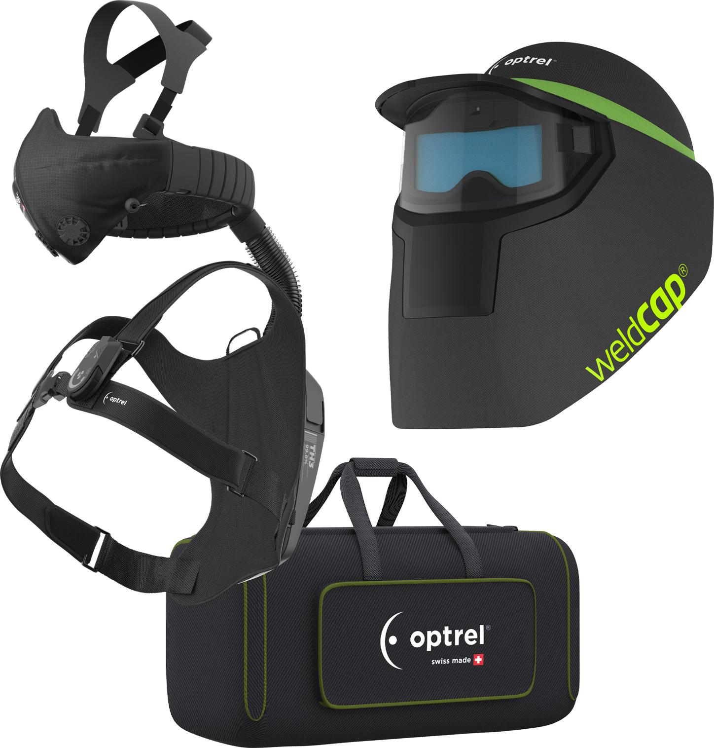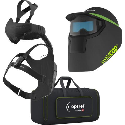 Ready-To-Weld käyttövalmis pakkaus hitsaus- ja hiontatöihin vaativaan ammattikäyttöön. Sisältää Optrel Weldcap RC tekstiilisen lippismallisen hitsausmaskin ja Optrel Swiss Air moottoripuhallin hengityksensuojaimen Comfort Half Mask puolinaamarilla, Control Panel ohjauspaneelilla, sekä laukun.