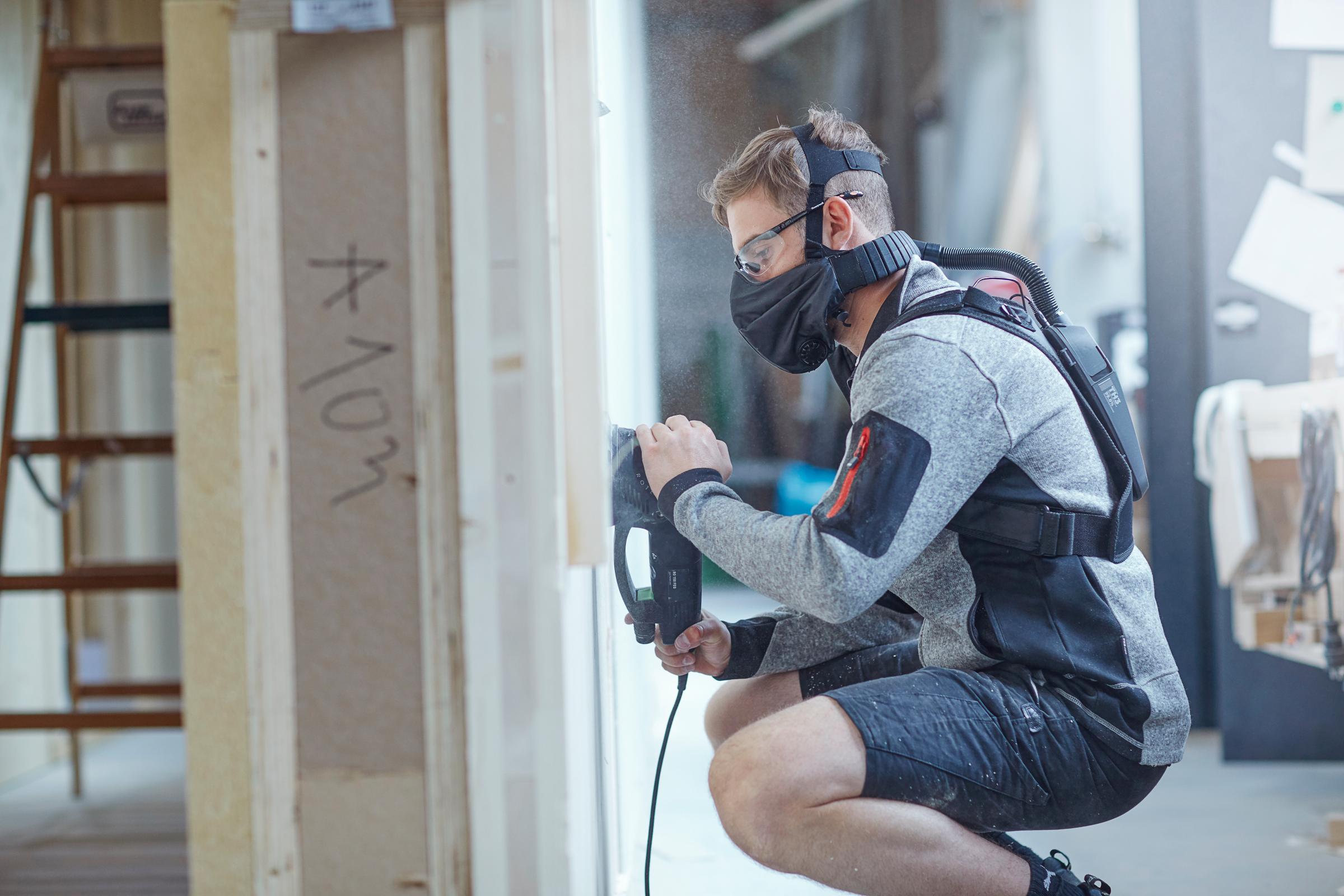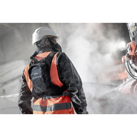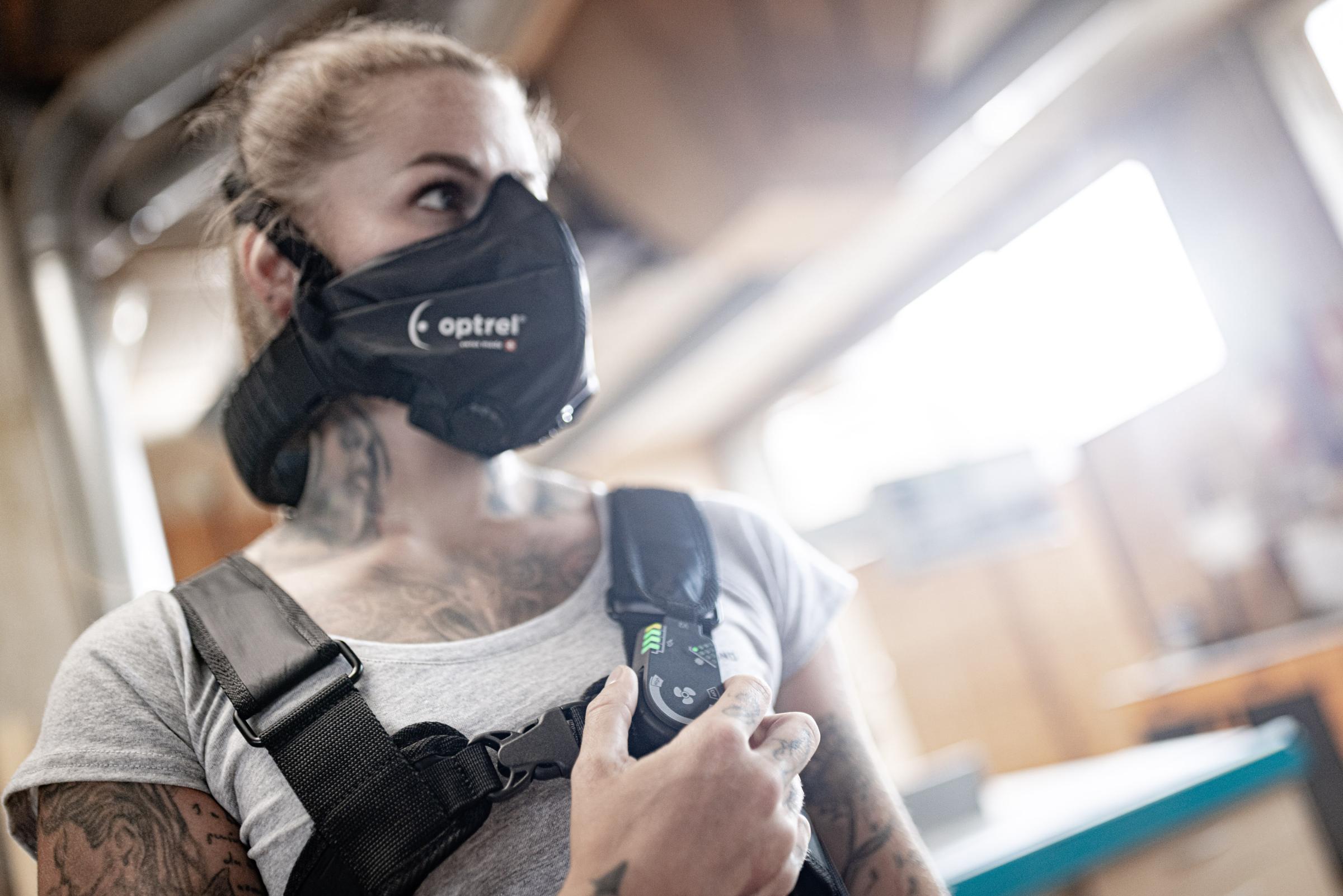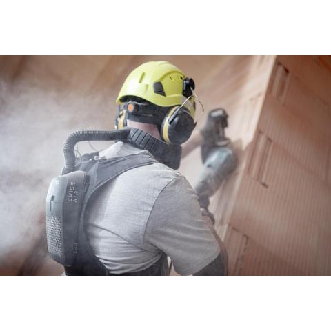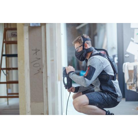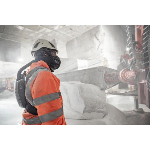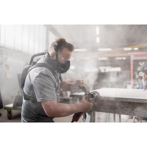 - Väljästi istuva tuulettuva puolinaamari, joka on valmistettu paloturvallisesta materiaalista, peittää suun ja nenän alueen kokonaan. Ylipaine tukee hengitystä ja estää väsymystä.