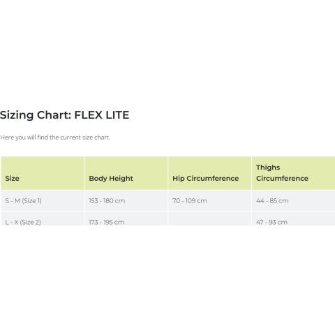 L-XXL: Käyttäjän pituus: 173-195 cm. Jalkalenkkien ympärysmitta 47-93 cm. Paino: 1280 g.