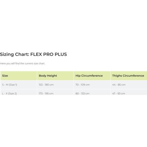 S-M: Lantiovyön pituus: 70-109 cm. Jalkalenkin pituus: 44-85 cm. Käyttäjän pituus: 153-180 cm. Paino: 1920 g.