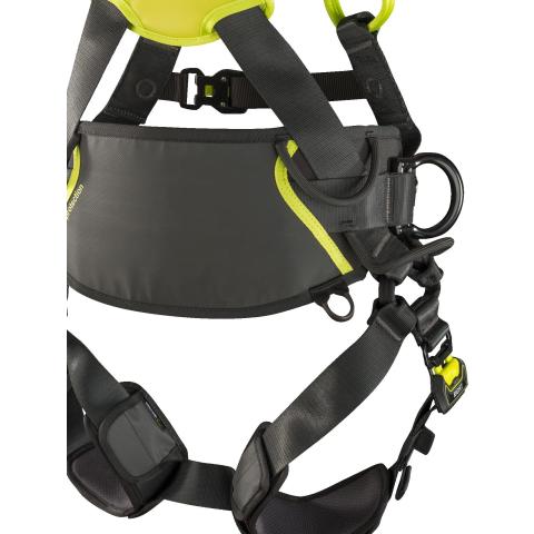 - Lantiovyön sivuilla työasemointiin alumiiniset kiinnityspisteet (EN358), jotka käännettävissä lantiovyötä vasten, kun niitä ei tarvita, joka helpottaa liikkumista ahtaissa tiloissa