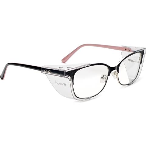 Tyylikkäät kaksoismateriaaliset suojalasikehykset reseptilinsseille työkäyttöön. Monipuolinen ja moderni naisten malli, joka mahdollistaa lukuisten eri tyyppisten linssien asentamisen mukaan lukien uusimmat linssi-innovaatiot. Kehys metallia ja sangat asetaattia metallilankaytimellä. Integroidut vaaleanharmaiksi sävytetyt sivusuojat niittikiinnityksellä; tarjoavat lisäsuojaa myös ylhäältä ja alhaalta. Säädettävät luistamattomat nenätyynyt. Ihanteellinen malli myös suuren voimakkuuden linsseille.