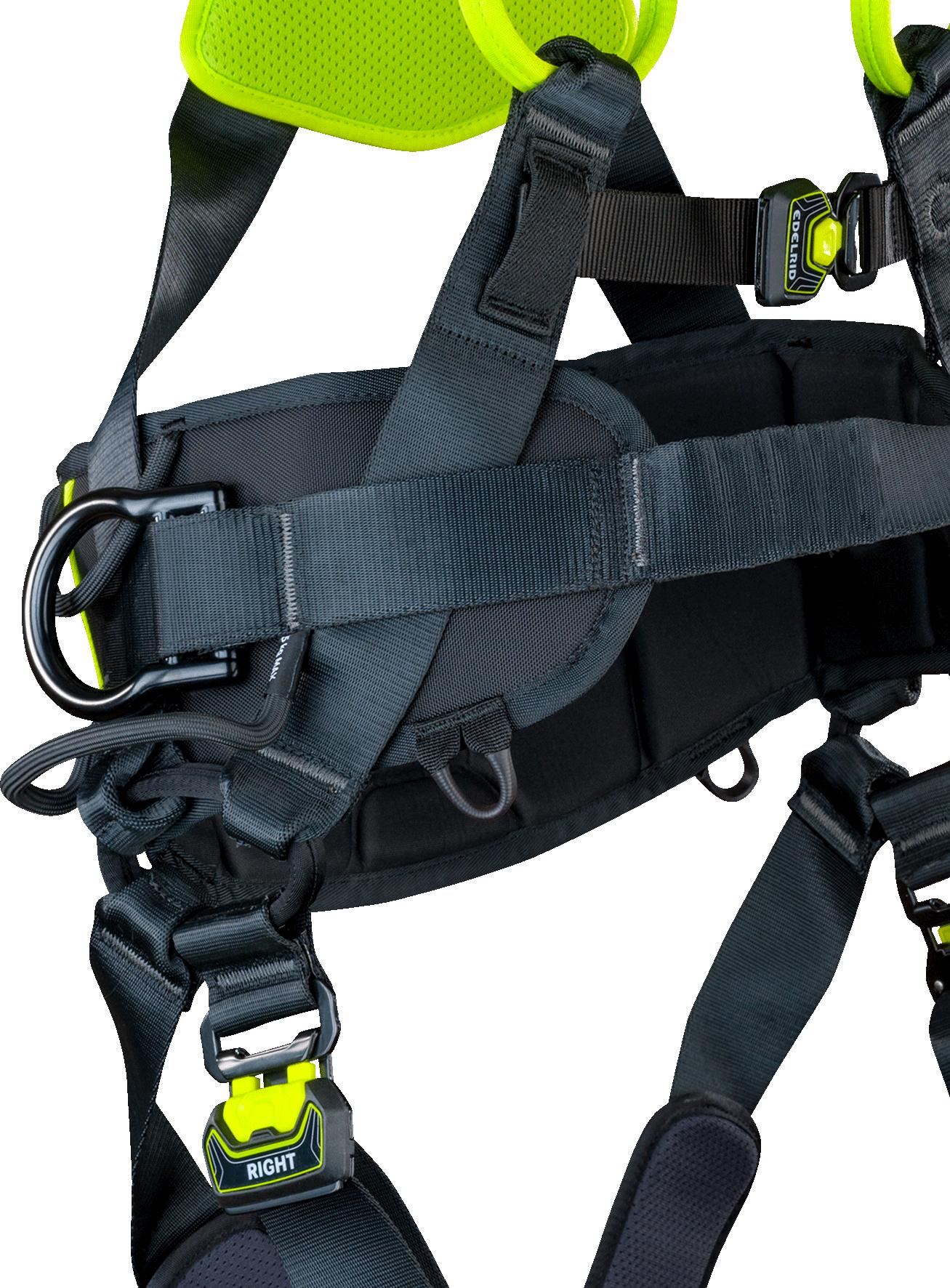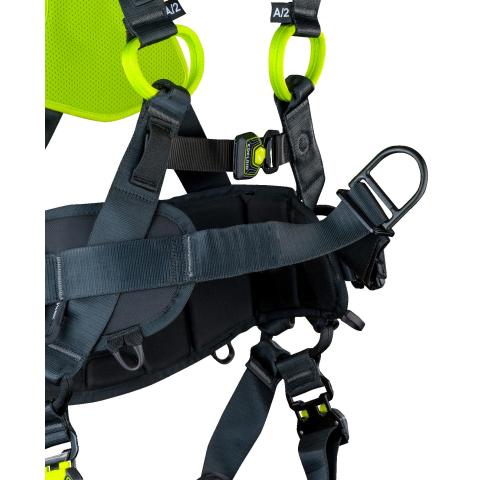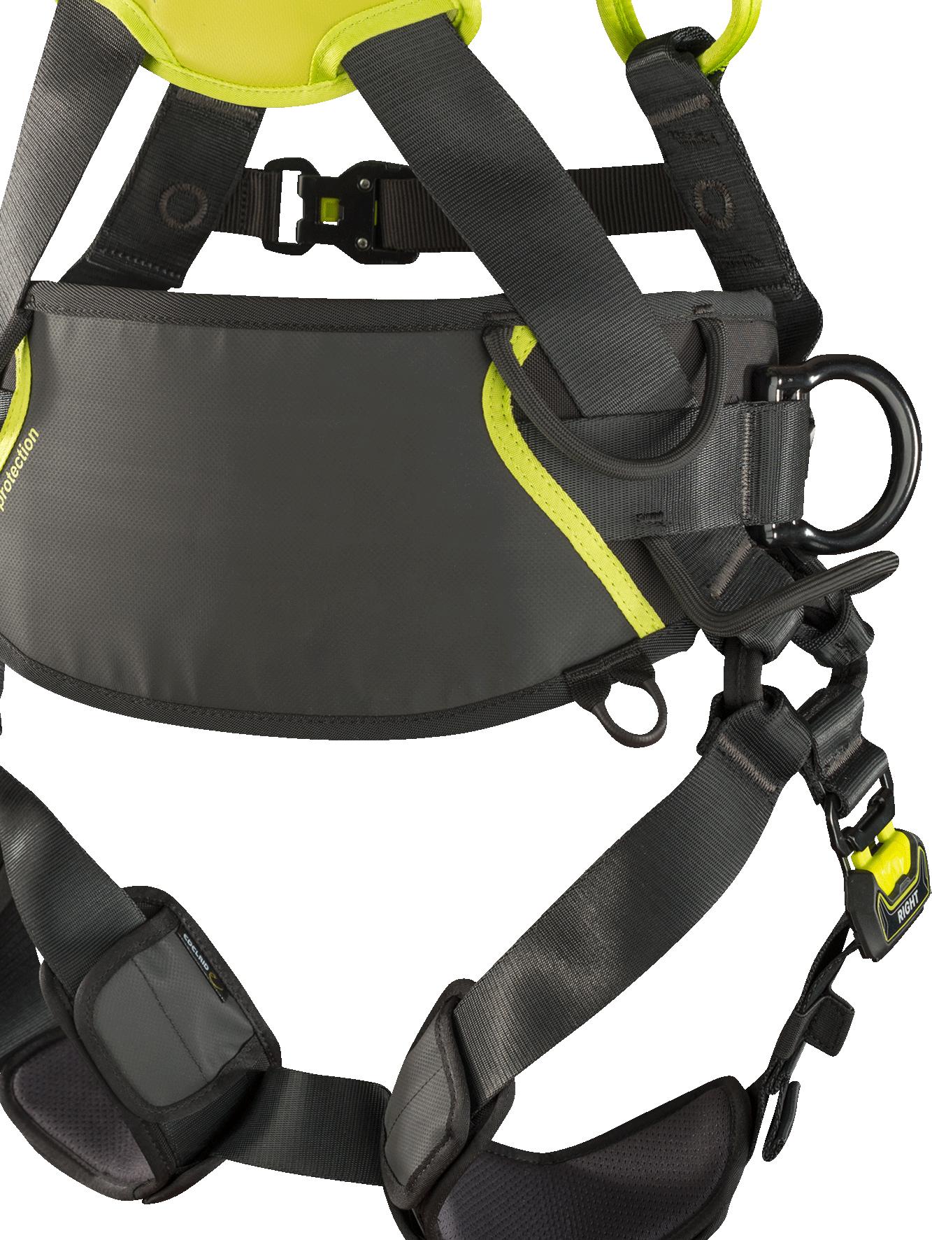 Valjaat on helppo pukea, ja pikasoljelliset jalkalenkit sekä pikasoljellinen etukiinnitys tekevät käytöstä nopeaa. Putoamisen pysäyttävän järjestelmän kiinnityspisteet rinnassa ja selässä.