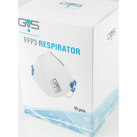 Pakkaus, jossa 15 kpl hygieenisiin yksittäispusseihin pakattuja GVS Segre Folded FFP3 R D hengityssuojaimia. Laatikko voidaan avata päältä tai alareunasta dispenser-jakolaatikoksi. Suositeltava valinta mm. teollisuuden, rakennusalan sekä terveydenhuollon ammattilaisten tarpeisiin. Sertifioitu myös lääkinnälliseksi laitteeksi.