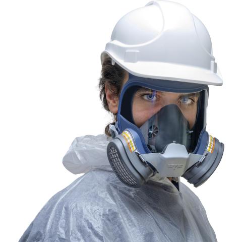 Kevyt kokokasvomallinen hengityksensuojain tiiviillä silmiensuojaimella ja vaihdettavalla ABE1P3 R D yhdistelmäsuodatinparilla: Hiukkassuodatus ja kaasusuodatus. Poikkeuksellisen leveä näkökenttä.