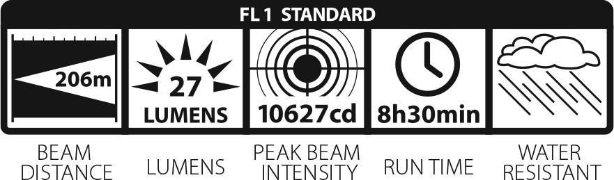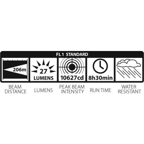 Valon voimakkuus 2D valaisimessa 10627 candelaa, valon kantama 206 metriä, valovirta 27 lumenia. Paloaika 8h 30min.