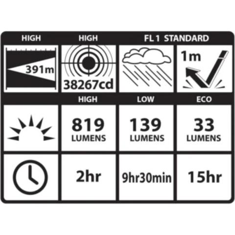 Suorituskyky ANSI FL1 standardin mukaisesti mitattuna. Valovirta max asetuksella 819 lumenia. Valon kantama 391 m. Valon voimakkuus 38 267 Candelaa. Iskunkestävä 1 m. Roiskevesitiivis IPX4.