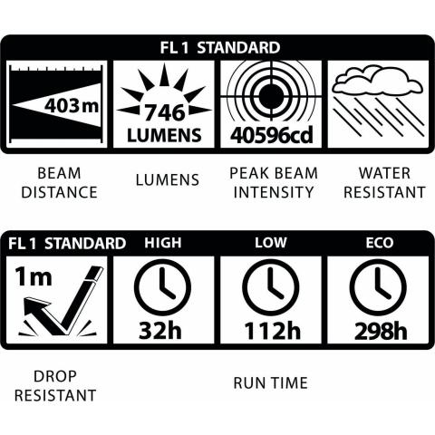 Suorituskyky ANSI FL1 standardin mukaisesti: Valon kantama 403 m, valovirta 746 lumenia, valon voimakkuus 40 596 candelaa. Paloaika Full Power asetuksella 32 h, Low Power asetuksella 112 h ja Eco asetuksella 298 h (joiden jälkeen on vielä 10 % alkuperäisestä valon voimakkuudesta jäljellä. Käytännössä valaisin palaa yhtäjaksoisesti yötä päivää n. pari viikkoa käyttökelpoisella valokeilalla, kunnes paristojen jännite on 0,99V ollen kokoluokkansa energiatehokkain valaisin markkinoilla!). Roiskevesitiivis IPX4. Iskunkestävä 1 m.