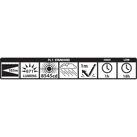 Suorituskyky ANSI FL1 standardin mukaisesti: Valovirta 671 lumenia, valon kantama 185 m, valon voimakkuus 8545 candelaa. Paloaika eco asetuksella 18 h ja max asetuksella 1 h.