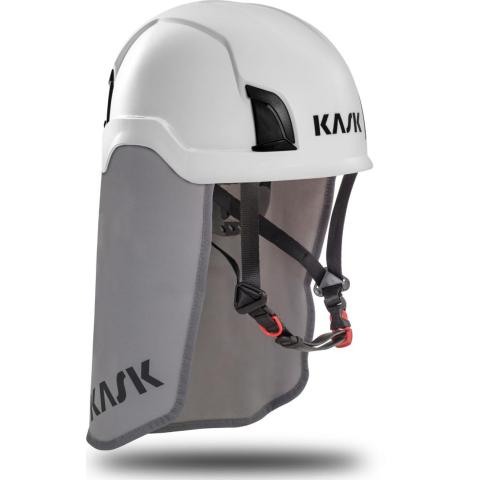 Harmaa niskasuojus Kask Primero ja Zenith X työkypärien takahelmaan. Helposti kypärässä oleviin kiinnityskoloihin napsauttamalla kiinnitettävä malli, joka suojaa niskaa ja korvalehtiä haitallisilta ultraviolettisäteiltä (UVA/UVB UPF50+), vesisateelta, lumisateelta, puupurulta, roiskeilta jne. Sivusuojaus säädettävissä. Suunniteltu käytettäväksi myös kuppikuulosuojainten kanssa.