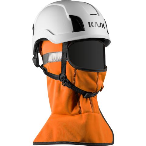 Kylmiin työolosuhteisiin suunniteltu päätä ja korvia lämmittävä korkealuokkainen kypärähuppu kaikkien työ- ja pelastuskypärien kanssa käytettäväksi.