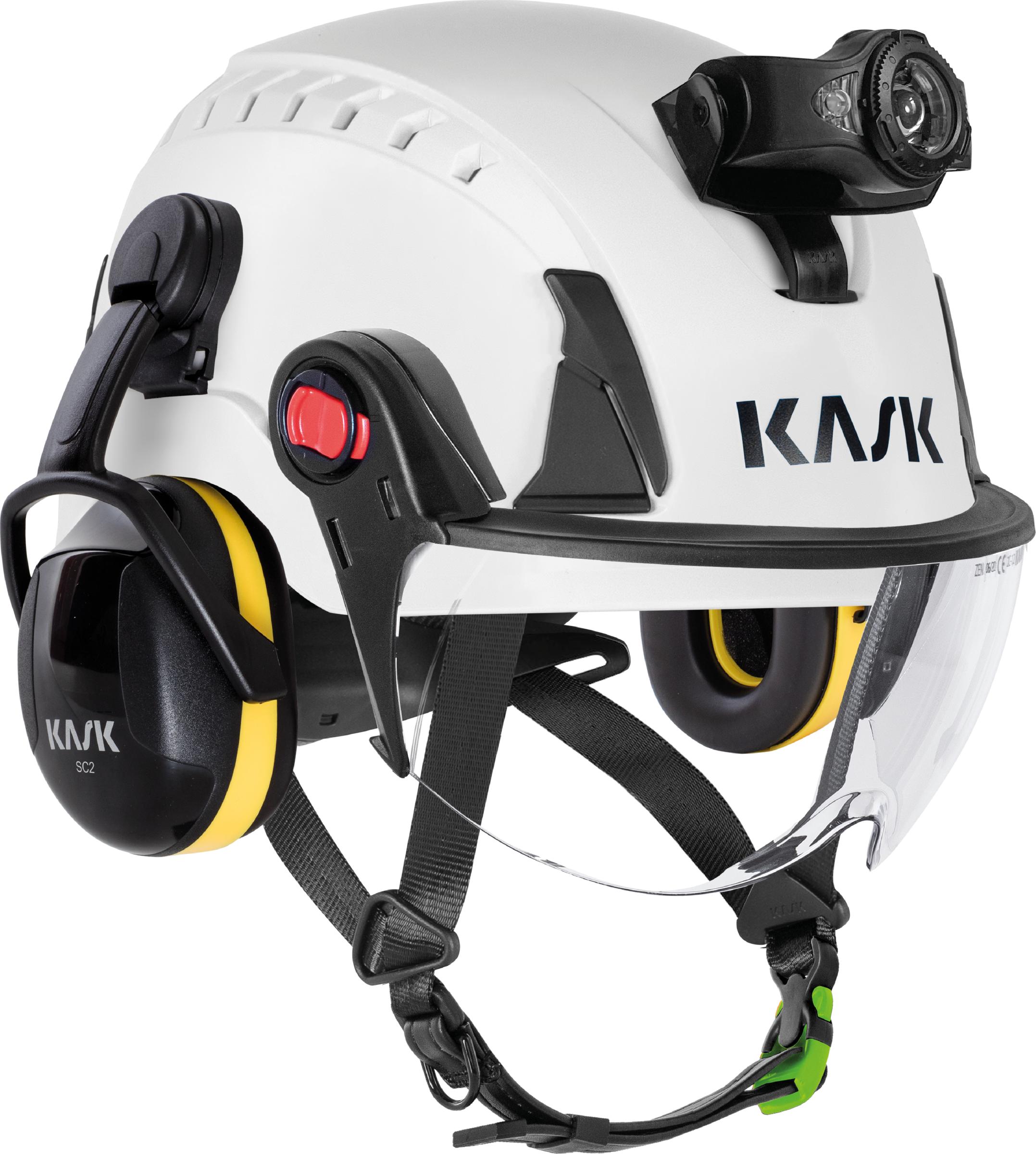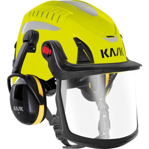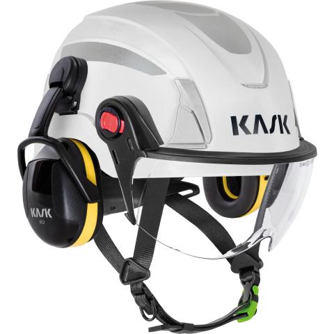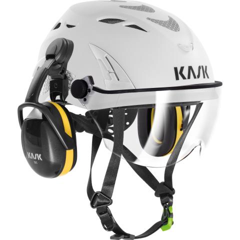 Kypäräkiinnikkeiden alalaidassa on käytävät, joihin saadaan liu’utettua Kask Superplasma Mesh Visor Carrier (WVI00005-) kokokasvosuojainten yläkehyksen varret. Tämä tarjoaa helpon ja kattavan silmien- ja kasvojensuojauksen samalla kun kuulosuojaimet ovat asennettuina.