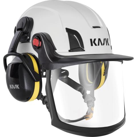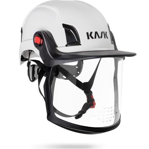Valmis setti, jossa Kask Zen FF (Full Face) Visor kirkas kokokasvosuojain (WVI00008-500), Zen FF Visor Carrier yläkehys (WAC00010-), sekä Zen Visor Adapters EasyClick pikakiinnikepari (WAC00009-) kehyksen kiinnittämiseksi Kask työkypäriin.