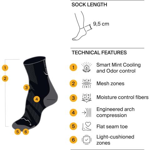 CoolNet-sukka on ohut ja miellyttävä jalassa, ja sen kevyet paneelit lisäävät ilmankiertoa ja pitävät jalan raikkaana myös pitkillä lenkeillä. Ohut ja kesähenkinen rakenne tekee sukasta erityisen miellyttävän lämpimissä olosuhteissa. Sukassa on litteä sauma, joka ehkäisee hiertymiä pitkissä suorituksissa.