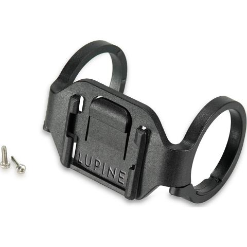 Kiiinnike, jolla Lupine Frontclick valaisimen (Esim PentaPro, Neo, Piko, Blika) valaisimen rungon saa kiinni polkupyörän ohjaustankoon. Ei vaadi paljon tilaa ohjaustangosta. Kiinnike on valmistettu muovista ja ruuvit ruostumattomasta teräksestä.