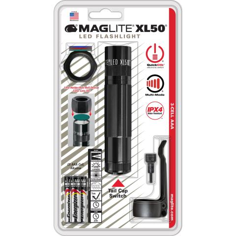 Maglite LED XL50 Tactical Combo Pack sisältää valaisimen, MOLLE-yhteensopivan lasikuituvahvisteisen taskuklipsin, kiinnitysavaimen klipsille, 3xAAA laadukkaat alkaliparistot, vierimisenesto/linssinpidikeholkin sekä värilinssit: punainen, sininen ja vihreä.