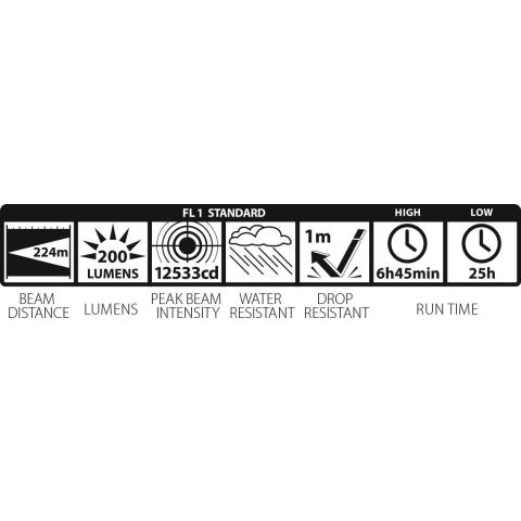 Taskuklipsissä kiinnitysreikä tarvikenarulle. Todellinen suorituskyky ilmoitetaan ANSI FL1 standardin mukaisesti: Valon kantama 224 m, valovirta 200 lumenia, valon voimakkuus 12533 candelaa. Paloaika Max asetuksella 6 h 45 min ja Energiansäästöasetuksella 25 h (joiden jälkeen on vielä 10% alkuperäisestä valon voimakkuudesta jäljellä). Iskunkestävä 1 m, roiskevesitiivis.