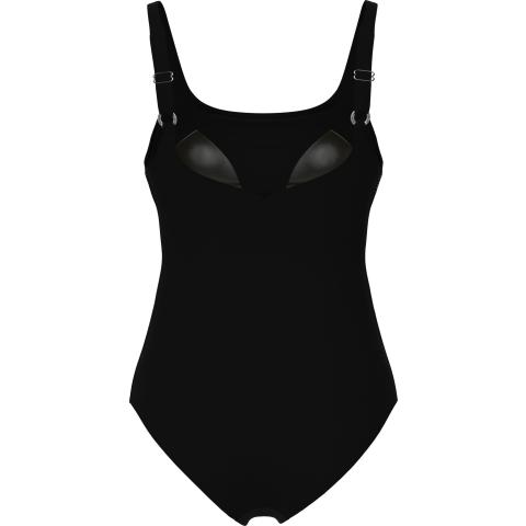 Uimapuvussa on kaksinkertainen kangas sekä kevyesti vatsaa litistävä verkkorakenne. Pehmeä liiviosa, tilavammat kiinteät kupit sekä leveä kuminauha rintojen alla kohottavat ja tukevat povea. Uimapuvun leveät, säädettävät olkaimet sekä umpinainen, hieman uurrettu selkäosa parantavat puvun istuvuutta.