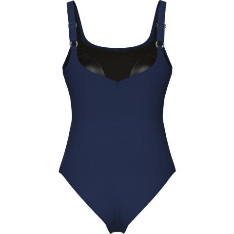 Uimapuvussa on kaksinkertainen kangas sekä kevyesti vatsaa litistävä verkkorakenne. Pehmeä liiviosa, tilavammat kiinteät kupit sekä leveä kuminauha rintojen alla kohottavat ja tukevat povea. Uimapuvun leveät, säädettävät olkaimet sekä umpinainen, hieman uurrettu selkäosa parantavat puvun istuvuutta.