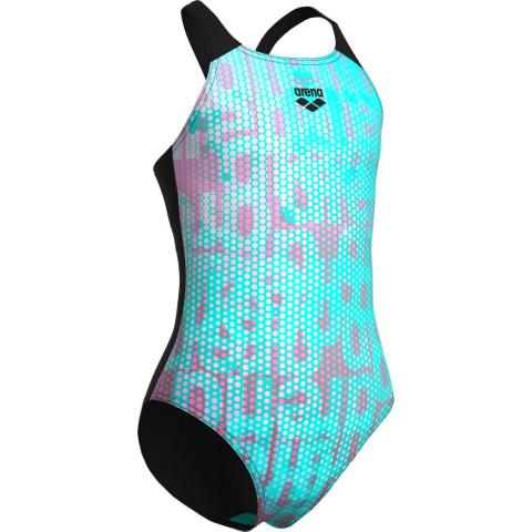 Tyttöjen värikäs Performance-sarjan uimapuku. Leveät ja tukevat olkaimet. V-selkäosa. Vuorikangas edessä*
