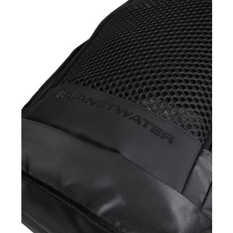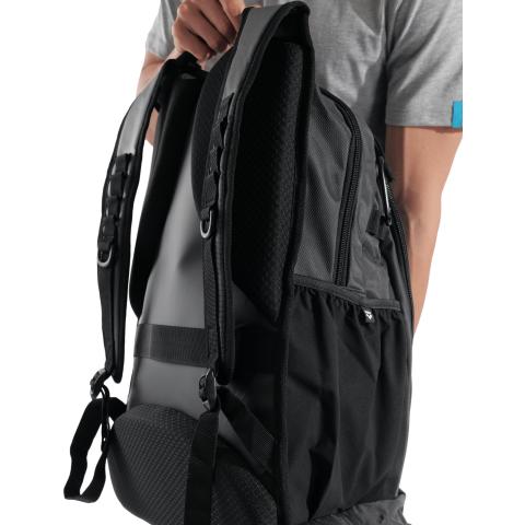 - Vetoketjullinen Aquabreathe-tasku edessä, joka on merkitty vesitippalogolla vetimessä. Aquabreathe-konseptin mukaan taskun sisäpuoli pitää vettä, joten tänne voi laittaa märät varusteet ilman, että muut tavarat kastuvat. Alaosassa hengittävää 3D-verkkoa.