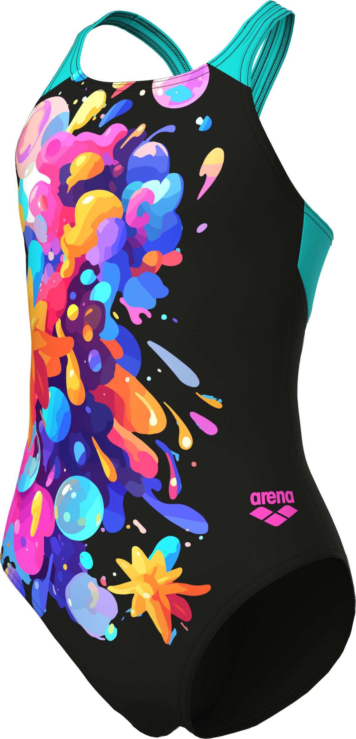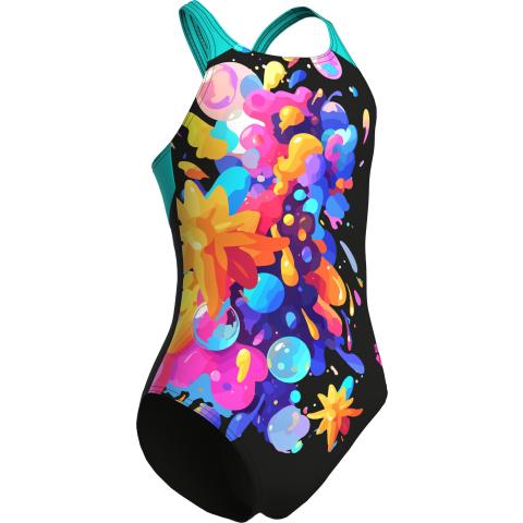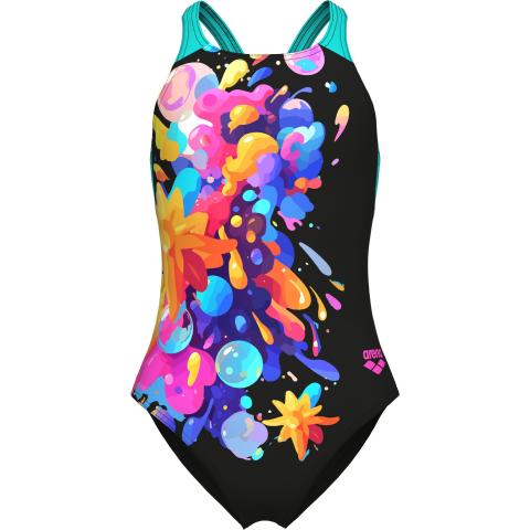 Painting V Back tyttöjen uimapuku MaxFit Eco -kankaalla. Puvussa on ergonominen sekä leveät ja tukevat olkaimet ja värikäs printti edessä.