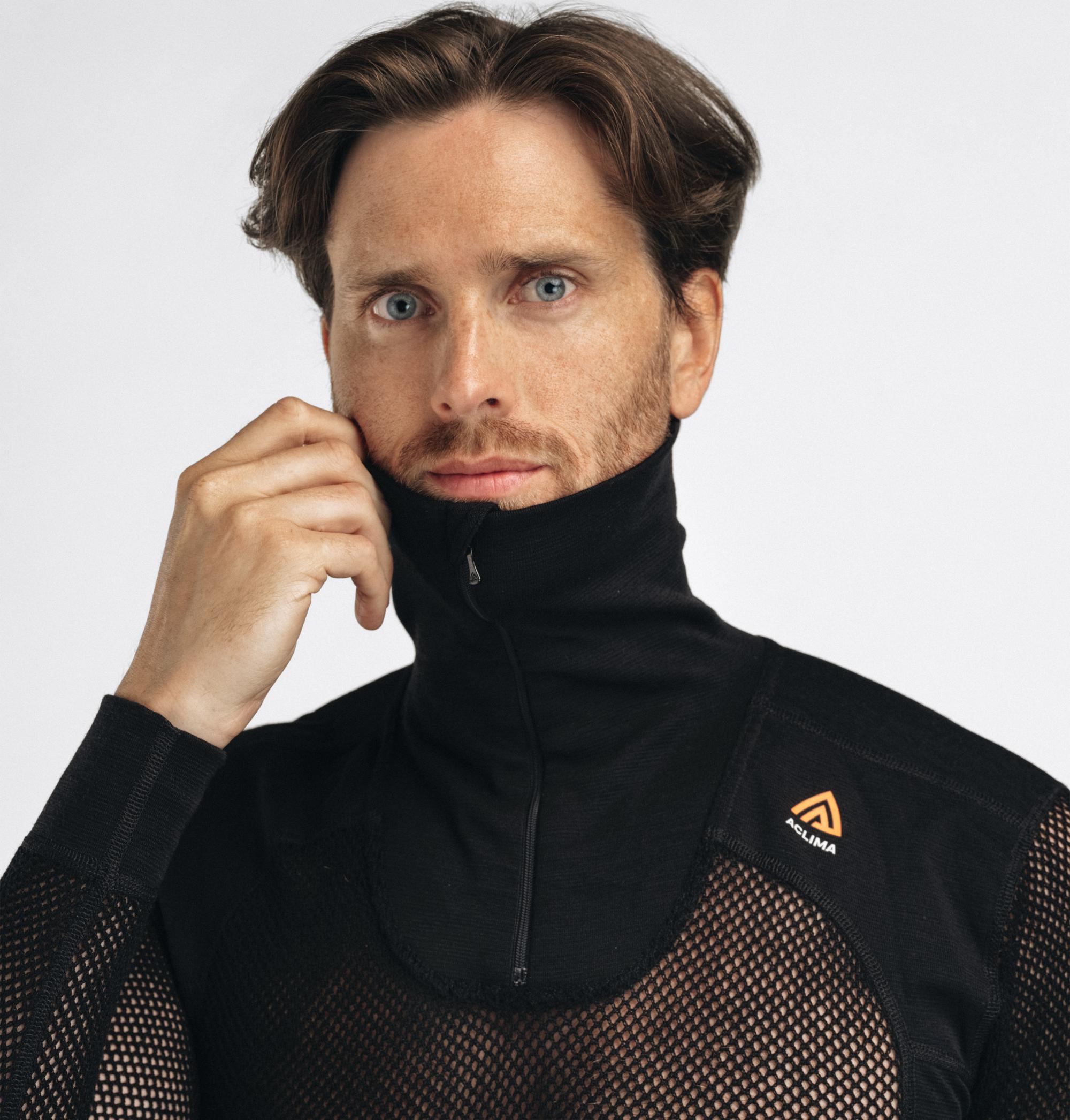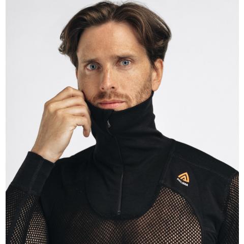 Miesten ainutlaatuinen, pitkähihainen, verkkoaluspaita poolokauluksella ja vetoketjulla. Lämpötilan hallinnan ja mukavuuden kannalta luonnonkuitujen yhdistäminen tekokuituihin on ylivoimaisen hyvä ratkaisu. Woolnet-rakenne, jossa käytetään pehmeää merinovillaa, on aina sopivan lämpöinen ja erittäin hyvin hengittävä. Kuitu imee jopa 30% kosteutta itseensä, ennen kuin se alkaa tuntua märältä. Hartiat ja kyynärpäät on erikseen vahvistettu. Total Easy Care-käsittelyn ansiosta Woolnet ei kutita, ja kutistuu erittäin vähän.