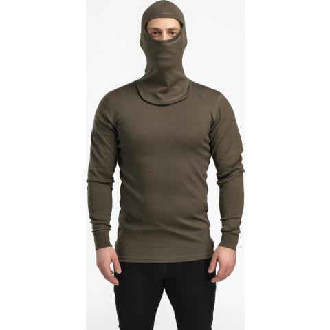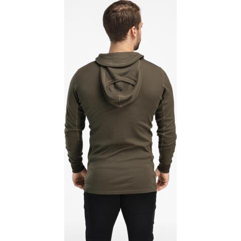 Miesten uusittu Warmwool-huppari. Kiinteää huppua voi käyttää myös kaulurina tai kääntää pois tieltä niskaan jolloin paidassa on O-kaulus. Toimii sekä alus- että väliasuna. Total Easy Care-käsittelyn ansiosta ei kutita ja kutistuu erittäin vähän.