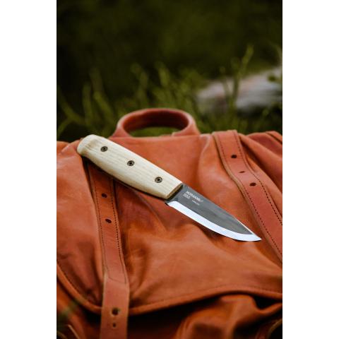 Ergonominen kahva valmistettu huolellisesti valitusta saarnista, joka on kotoisin Eurooppalaisista FSC-sertifioiduista metsistä. Kahva varustettu sormisuojalla, ja suunniteltu tarjoamaan ihanteellisen tasapainon suurella työstötarkkuudella lukuisilla erilaisilla otteilla käytettynä. Terässä tehokas drop-point kärki. Hamarapuoli suunniteltu yhteensopivaksi tuluksien kanssa käytettäväksi.