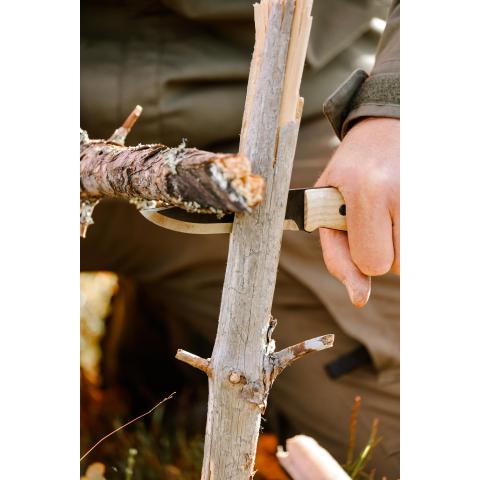 Ergonominen kahva valmistettu huolellisesti valitusta saarnista, joka on kotoisin Eurooppalaisista FSC-sertifioiduista metsistä. Kahva varustettu sormisuojalla, ja suunniteltu tarjoamaan ihanteellisen tasapainon suurella työstötarkkuudella lukuisilla erilaisilla otteilla käytettynä. Terässä tehokas drop-point kärki. Hamarapuoli suunniteltu yhteensopivaksi tuluksien kanssa käytettäväksi.