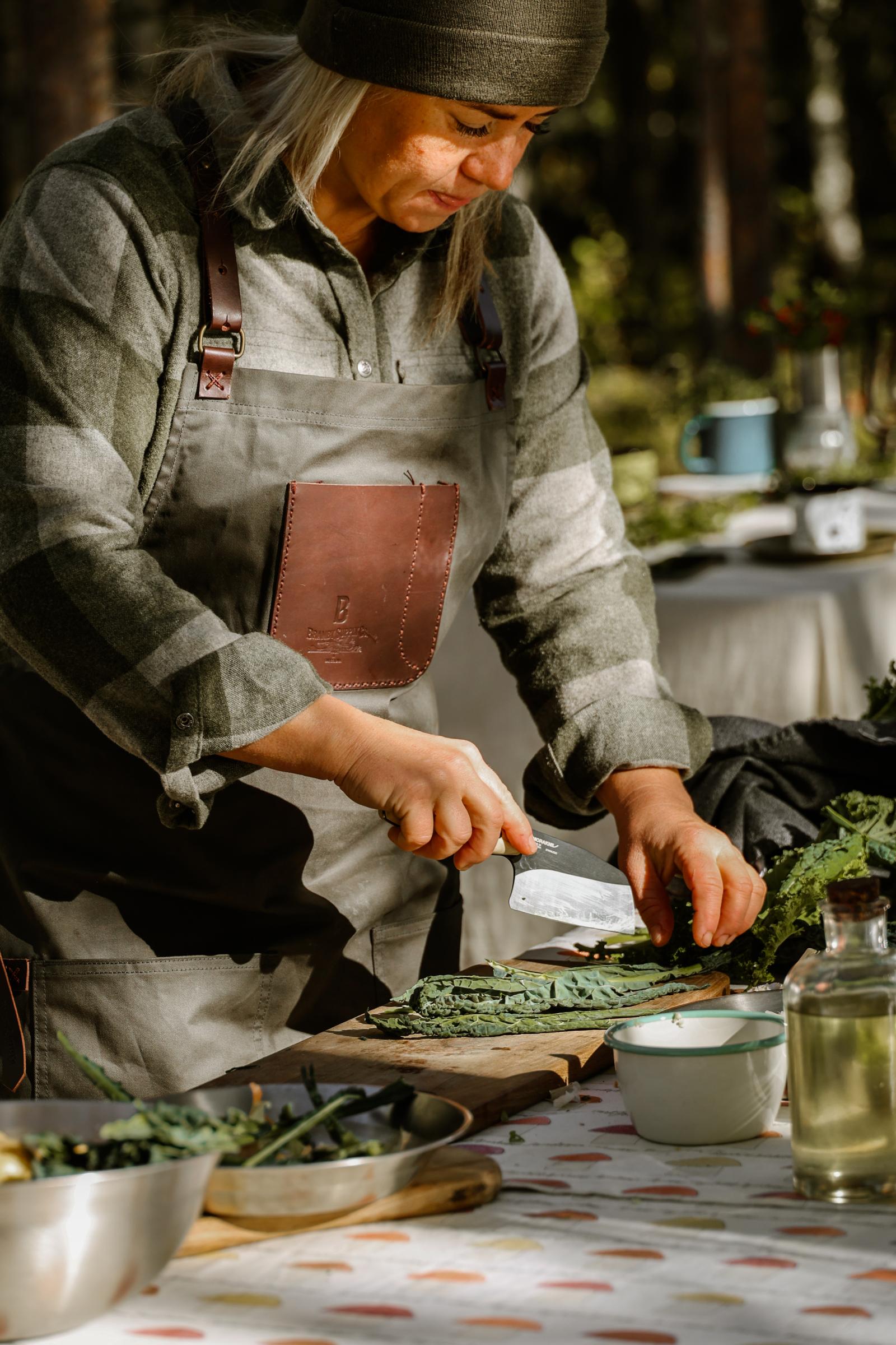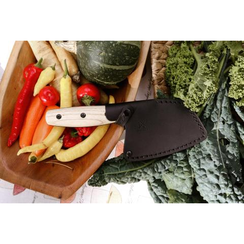 Käsityönä valmistettu ohutteräinen full tang veitsi, joka on suunniteltu ihanteelliseen ruuanlaittoon ulkoilmaolosuhteissa. Kompakti ja monipuolinen malli, joka on suunniteltu kulkemaan helposti mukana taskussa tai repussa. Varuste, joka mahdollistaa kokkaustaitojen kehittämisen uudelle tasolle. Toimitetaan kasvivärjätyn nahkasuojuksen kanssa, joka suojaa veitsen terää huolellisesti.