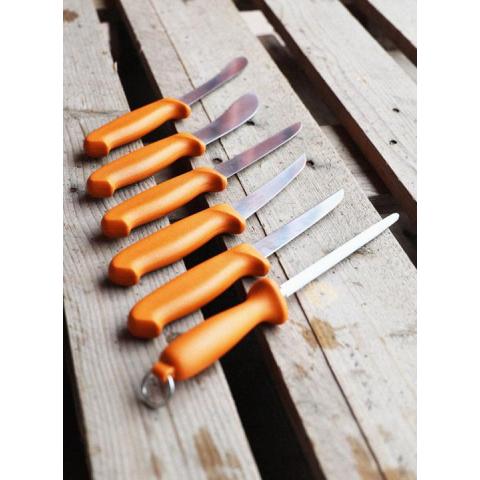 Korkealuokkainen metsästäjän boning-veitsi ohuella, kapealla notkealla terällä. Monipuolinen veitsi, joka soveltuu lukuisiin eri tarpeisiin. Esimerkiksi lihan fileointiin kuin ahtaimpien kohtien erotteluunkin. Tarjoaa erinomaisen tuntuman, tarkkuuden, ja minimoi lihan hukkaa. Toimitetaan hygieenisen ja helposti puhdistettavan tummanvihreän teräsuojuksen kanssa, jossa käytännöllinen lukitus.