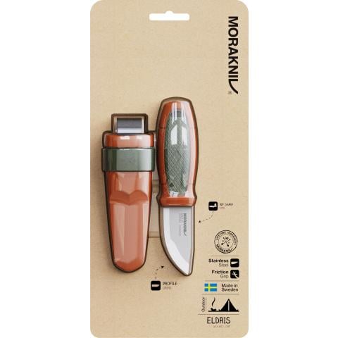 Kahva on valmistettu kahdesta erilaisesta polymeeristä, ja kylkien TPE pinta tarjoaa erinomaisen otteen tehostaen työskentelyä. Sekä kahvassa että tupen kärjessä reikä narulle. Käytännöllinen ja helposti puhdistettava polypropyleenituppi. Symmetrinen muoto mahdollistaa puukon laittamisen tuppeen molemmin päin. Puukko lukittuu tuppeen Click Lock lukituksella, joka varmistaa puukon pysymisen tupessa myös kaulanauhassa kuljetettaessa. Puolihimmeän, Scandi Grind profiilihiotun terän materiaali kierrätetty ruotsalainen ruostumaton erikoisteräs, joka on käsitelty Moraknivin salaisella lämpökäsittelyllä. Pysyy erittäin terävänä pitkään. Kokonaispituus: 145 mm. Terän pituus: 59 mm. Terän paksuus: 2 mm. Kokonaispaino 89 g. Materiaali- ja valmistusvirhetakuu 10 vuotta. Valmistusmaa Ruotsi.