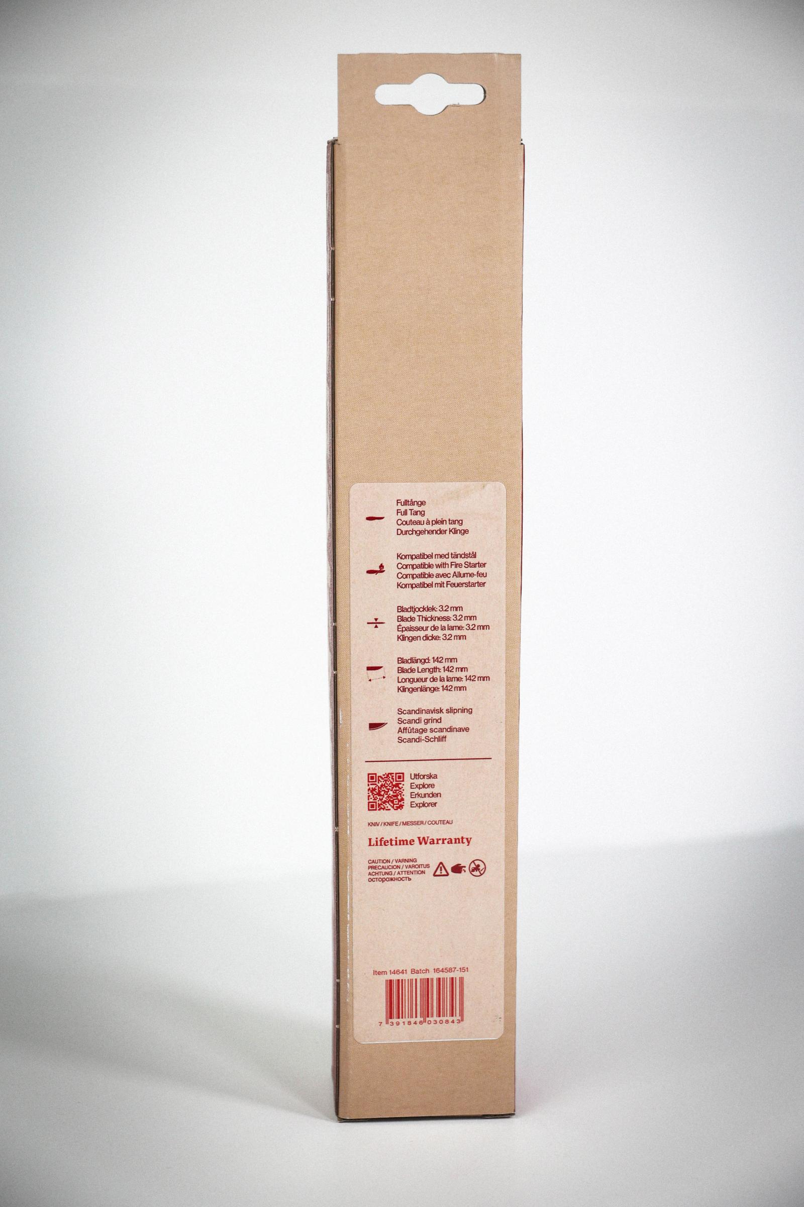Toimitetaan piikkiin ripustettavasssa retail -lahjapakkauksessa, jonka mitat: 32,5 cm x 5,7 cm x 4,5 cm. Pakkaukseen kuuluu: Puukko ja nahkatuppi.