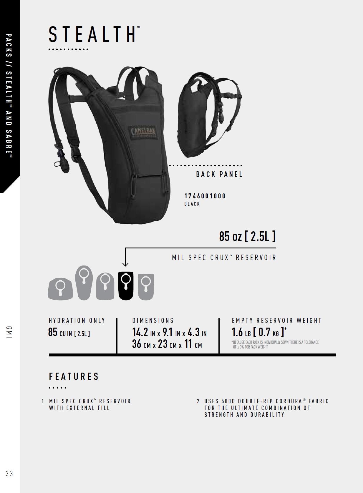 Rakenne yksinkertaistettu mahdollisimman kulutuskestäväksi. Olkaviilekkeet ja rintaremmi voidaan pikasolkien ansiosta avata nopeasti, jolloin repusta päästään irti mahdollisessa onnettomuus- tai takertumistilanteessa. Pääsy repun päältä suoraan Mil Spec Crux säiliöön mahdollistaa nopean täyttämisen ilman säiliön poistamista repusta. Säiliö on omassa osastossa, joka on täysin eristetty 5 mm suljetulla vaahtoeristeellä, joka pitää juoman viileänä pitkään. Crux säiliön suuri täyttöaukko mahdollistaa helpon täyttämisen, jään lisäämisen ja turvallisen puhtaanapidon. Säiliö Mil Spec Crux™, tilavuus 2,5 L. Repun mitat 36 cm x 23 cm x 11 cm. Paino 0,7 kg. Materiaalina erittäin vahva ja kulutuskestävä 500 Double-rip Cordura. Materiaali- ja valmistusvirhetakuu 10 vuotta.