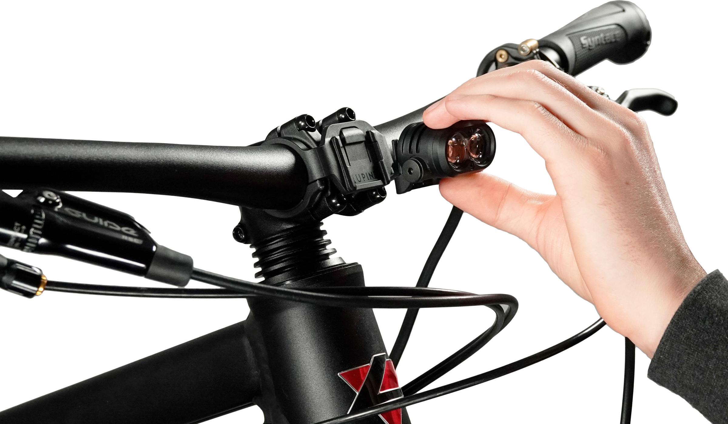 Kiiinnike, jolla Lupine Frontclick valaisimen (Esim PentaPro, Neo, Piko, Blika) valaisimen rungon saa kiinni polkupyörän ohjaustankoon. Ei vaadi paljon tilaa ohjaustangosta. Kiinnike on valmistettu muovista ja ruuvit ruostumattomasta teräksestä.