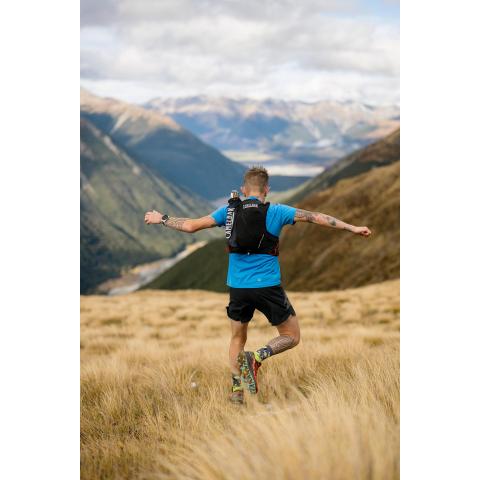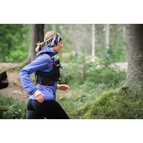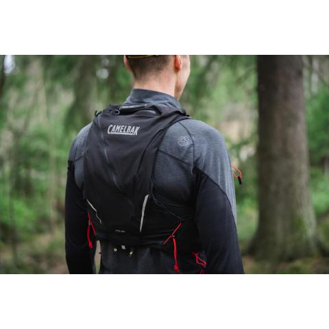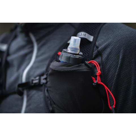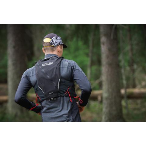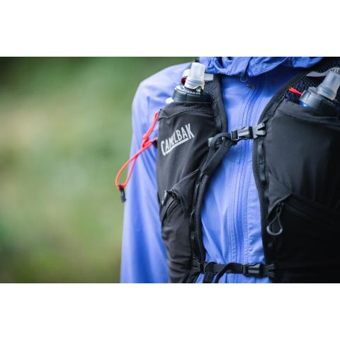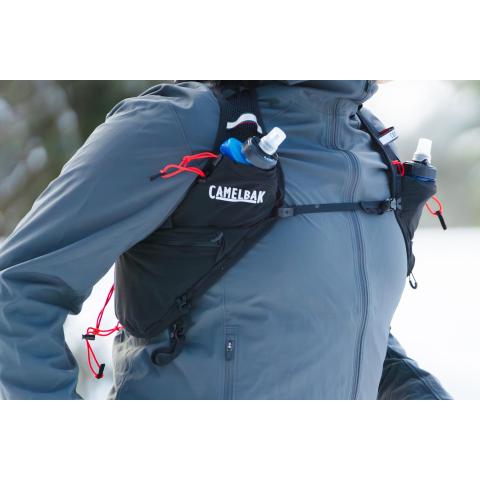 Liivi on suunniteltu ultrakevyeksi ja mallin istuvuus on huippuluokkaa, jolloin se pysyy paikallaan vauhdikkaammassakin kisassa. Etupuolella on kaksi joustavaa taskua CamelBak Quick Stow 0,5L pulloille (sis.), jolloin juoksijalla on mahdollisuus varata toinen pullo vaikka urheilujuomalle ja toinen vedelle.