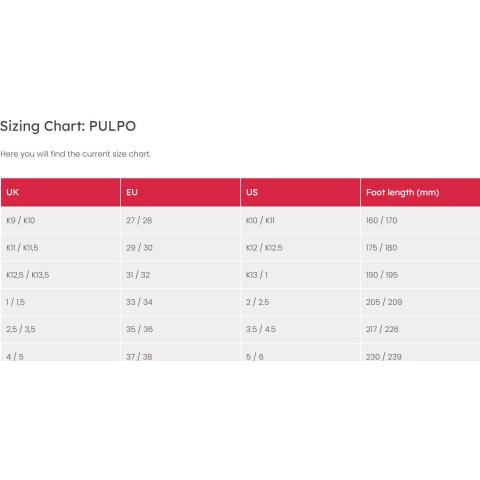 Pulpo on suunniteltu erityisesti lasten jalkoja varten, ja tarjoaa kiipeilysuorituskykyä vaikuttamatta vielä kasvaviin jalkateriin, eikä jätä jalkoihin painaumia. Kantapään alueelle on integroitu joustava insertti, joten PULPO kasvaa nuoren käyttäjän mukana. Laajan tarranauhahihnan ansiosta nämä tossut ovat helppo pukea ja riisua.